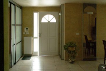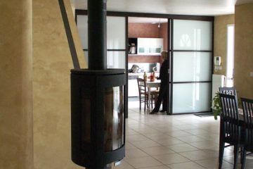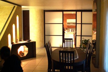 Снос перегородок между прихожей / кухни и прихожей / столовой приносит радость и яркость всему: вход, очищенный таким образом, открывает вид на остальную часть дома, а гостиная и кухня разделены только простыми мобильными глазурованными перегородками.
