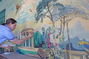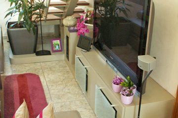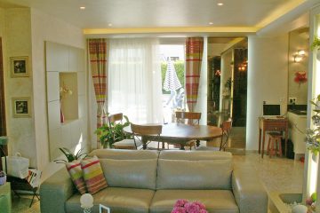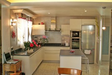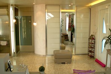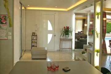 На стенах присутствие зеркал спрятавших батареи усиливает восприятие открываемого пространства. Циркуляция оптимизируется с помощью мобильной кухни и удаления углов на проходах.