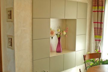 Сначала пространство было переделано для создания единицы жилой площади. Центральная колонна, одетая и превращенная в декоративную мебель, является переходным элементом между четырьмя пространствами жизни.