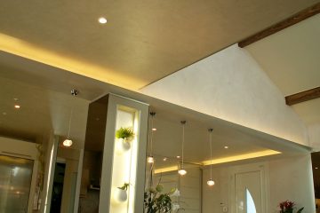 Скрытое освещение с помощью подсвеченных карнизов, гармония цветов, форм и современных материалов завершают картину современного интерьера.