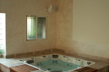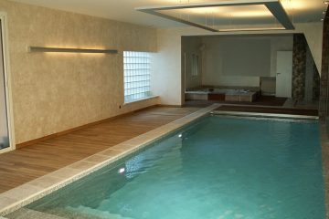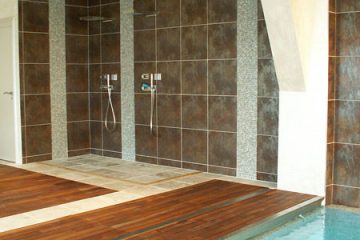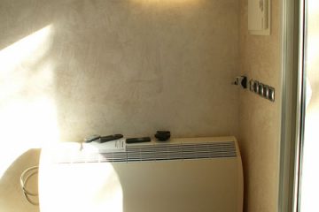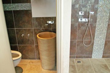 Le choix s’est porté sur des matériaux nobles et traditionnels tel le chêne clair, le travertin et pour donner une touche plus moderne le corian. La paroi de douche en Dacryl sublimant l’espace.