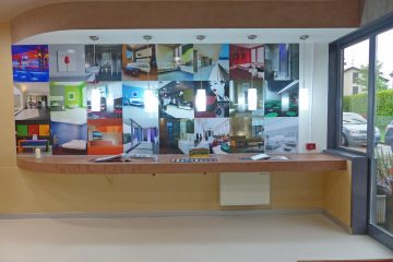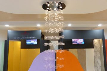 В качестве доминирующего мотива мы предложили использовать «мозаику» небольших панелей, фотографий и образцов продуктов. Скрытое освещение округлых, прямоугольных двухуровневых потолков создают большую перспективу.