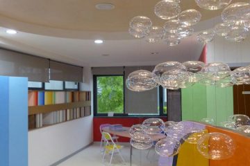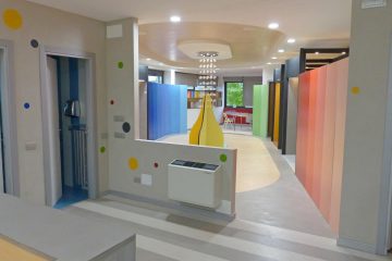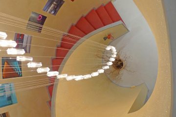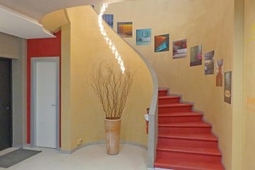 Идея добавить движение небольших элементов, таких как потолочные светильники, картины, которые “бегут” по лестнице, плитки, которые украшают стены и потолок, позволили нам «смягчить» прямоугольные пространства.