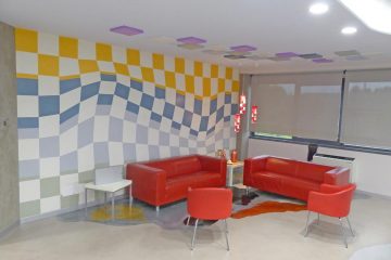Сторона гостиной оживлена динамическим рисунком, состоящим из форм, напоминающих панели образцов продуктов.